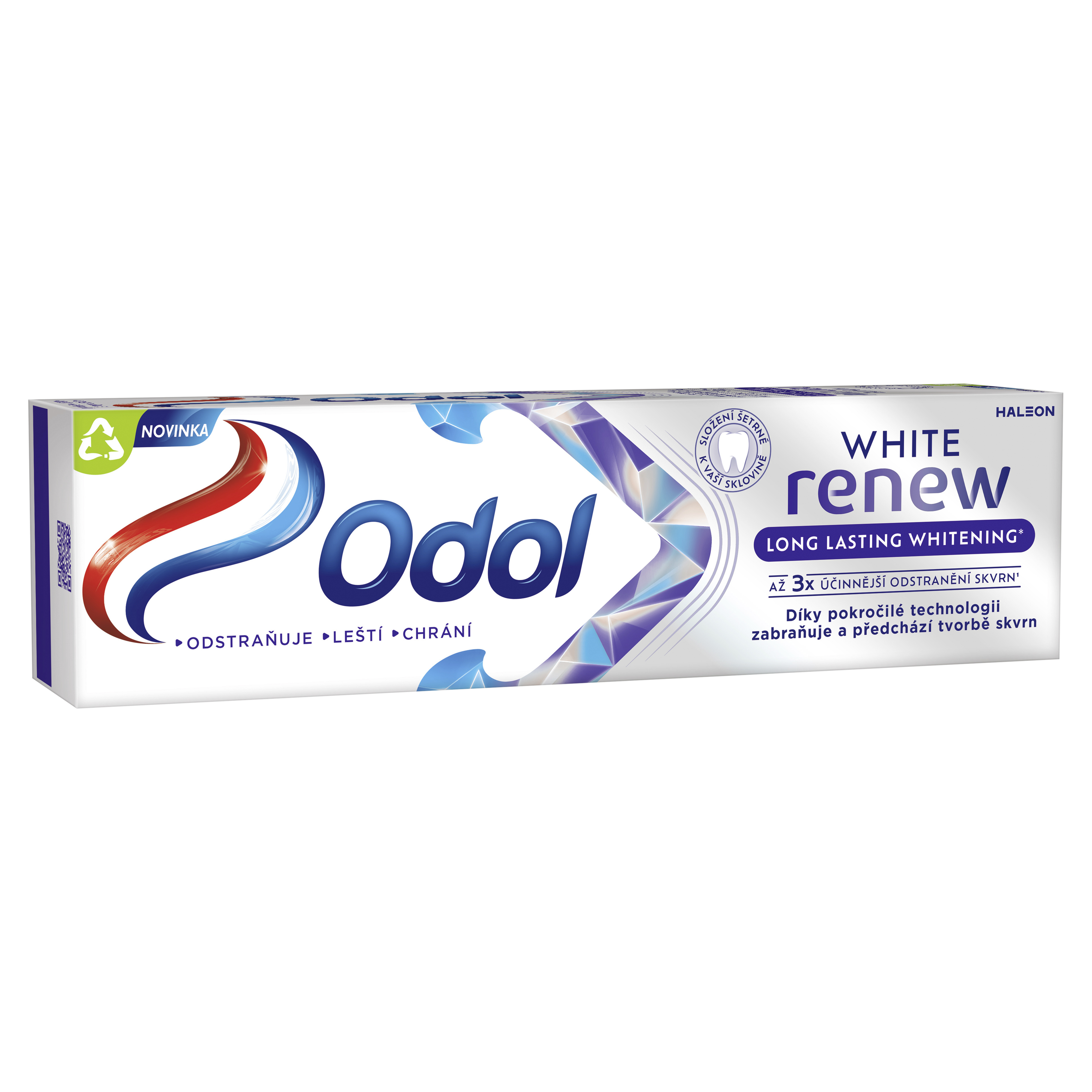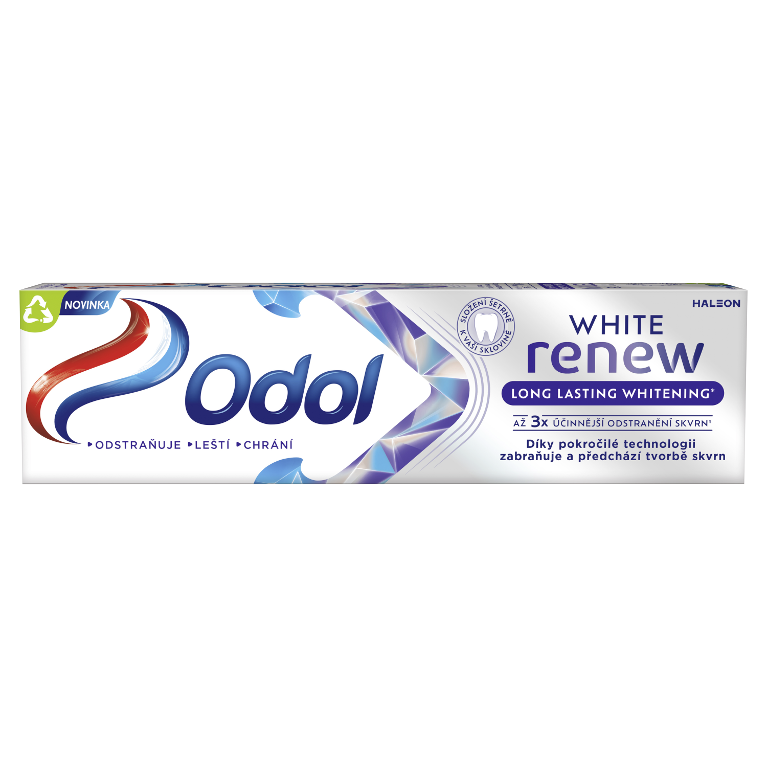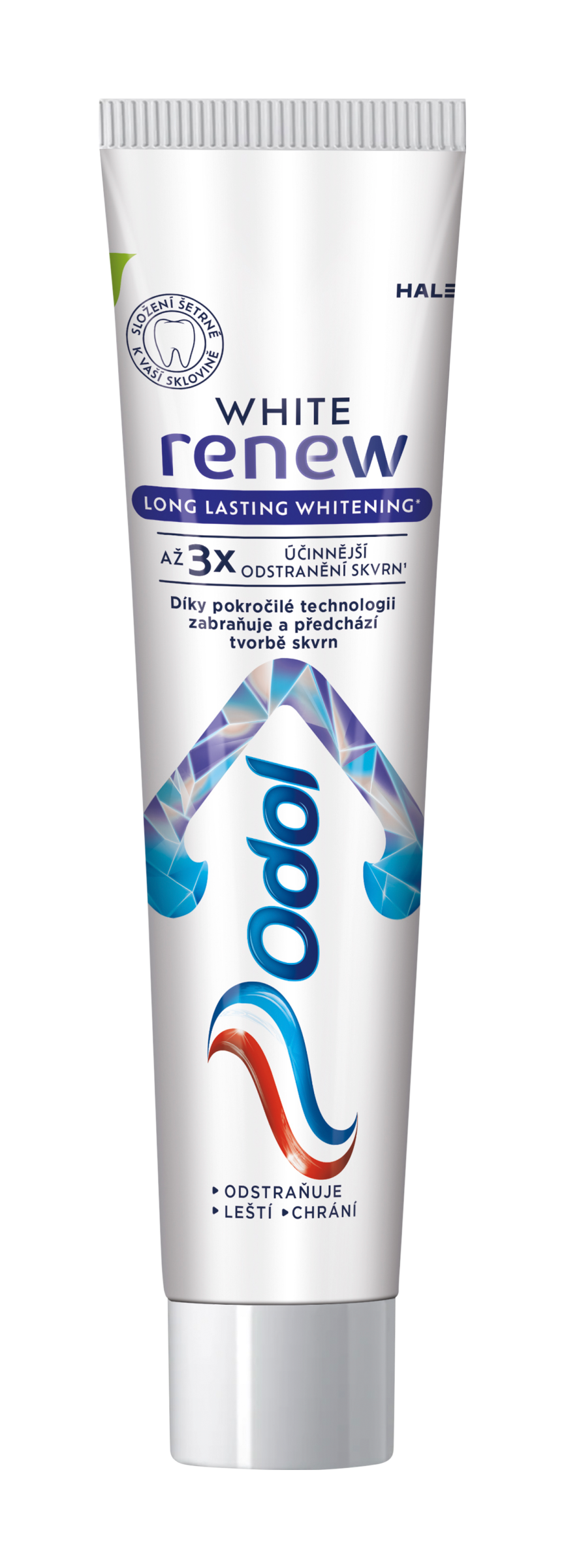 Až 3x účinnější odstranění skvrn¹ Odol White renew Long Lasting Whitening* obsahuje klinicky testovanou bělicí technologii, která odstraňuje skvrny a navrací tak zubům jejich přirozenou bělost. Díky naší dosud nejlepší bělicí technologii poskytuje až 3x účinnější odstranění skvrn a zároveň obnovuje pevnost zubní skloviny*. Se složením šetrným k zubní sklovině. S příchutí máty, která poskytuje pocit svěžesti.
