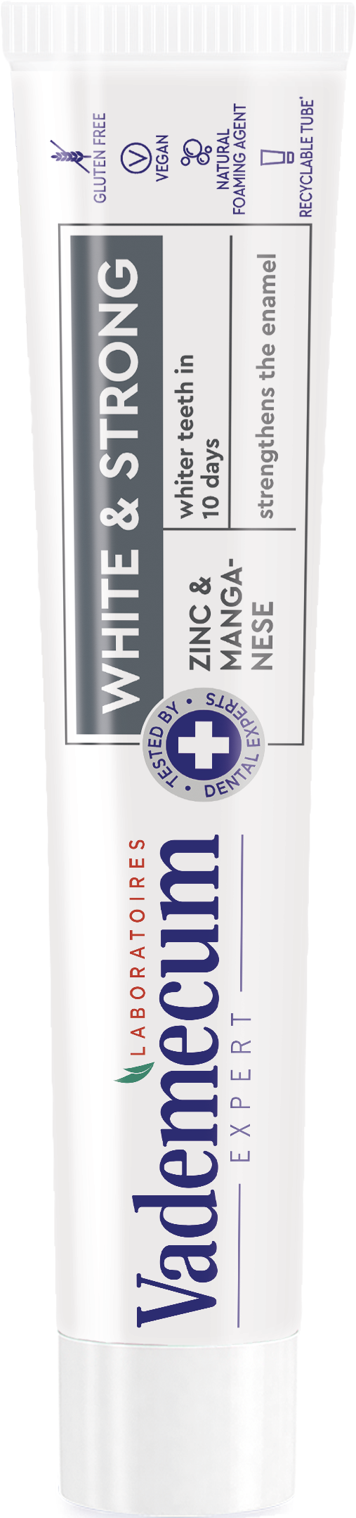 Vademecum White & Strong se zinkem a manganem: Receptura zubní pasty jemně odstraňuje skvrny a bělí vaše zuby již za 10 dní*, posiluje zubní sklovinu a odstraňuje až 99 % bakterií. S přírodním pěnidlem. 100% recyklovatelné balení. Obsahuje fluorid sodný (1 450 ppm F⁻).