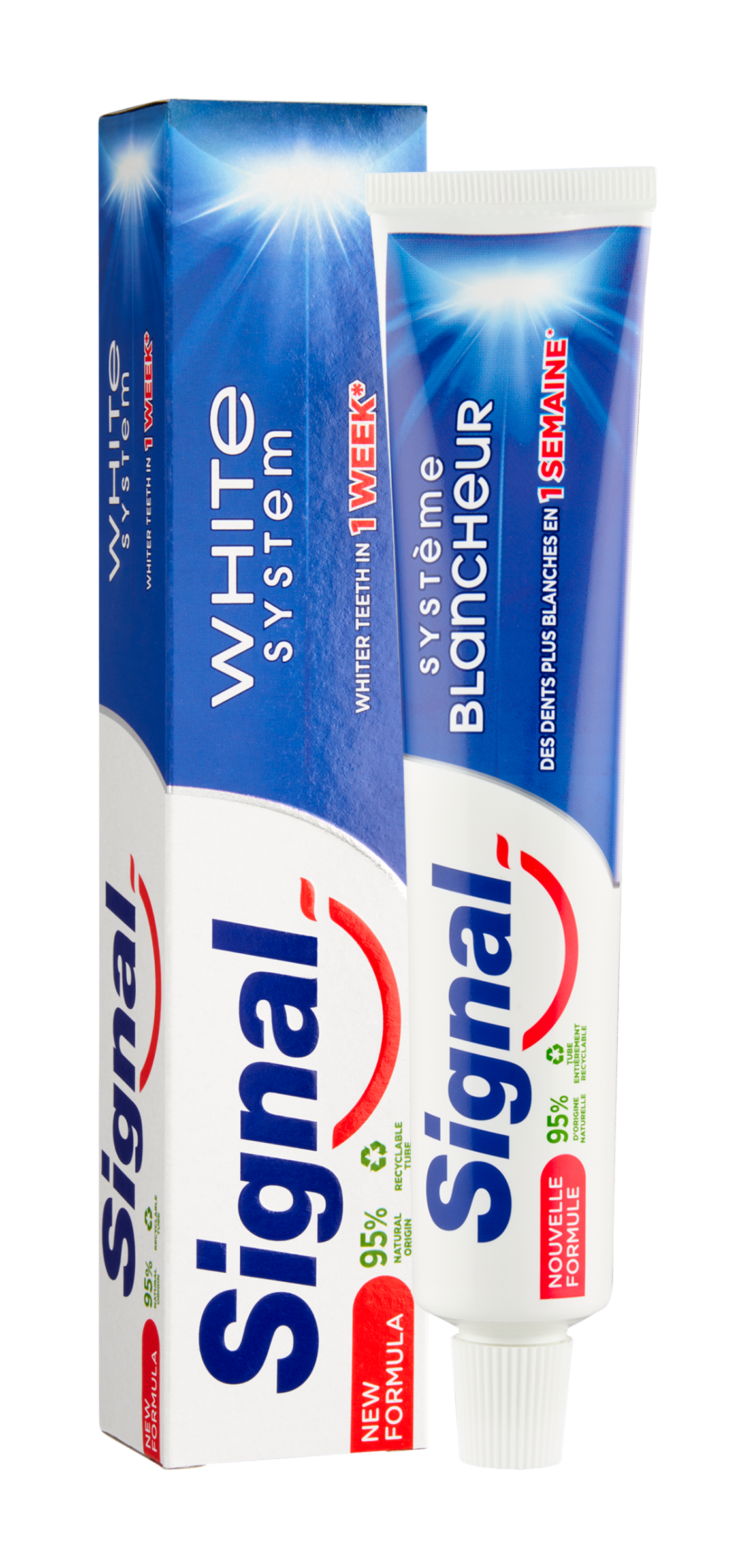Zubní pasta Signal White System obnovuje přirozenou bělost Vašich zubů a pomáhá aktivně posilovat zubní sklovinu. Její složení obsahuje přirozeně se vyskytující bělící minerály, které jemně očistí povrch zubu a odstraní skvrny. Díky tomu dosáhnete přirozeně bělejšího a zářivějšího úsměvu již za 1 týden.*