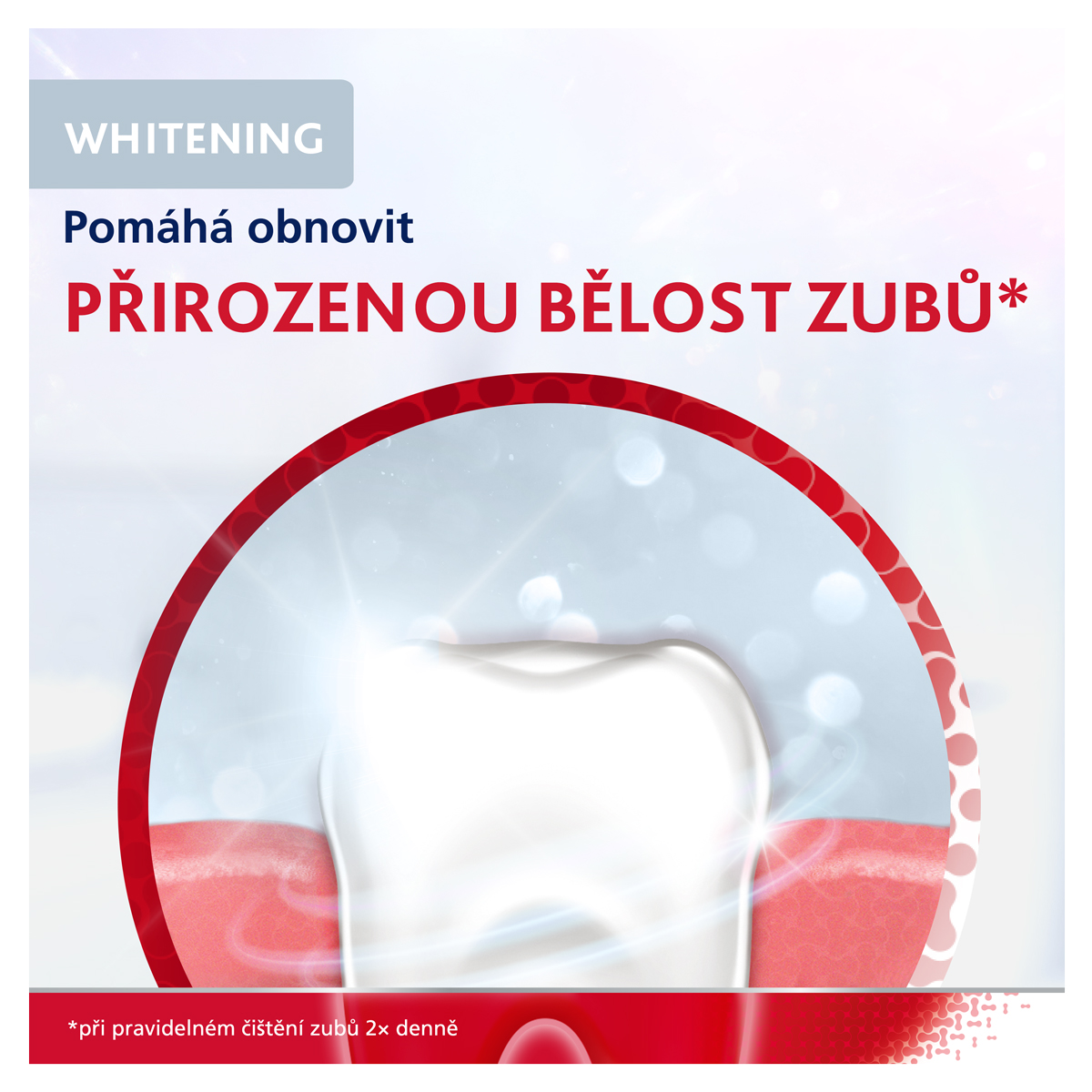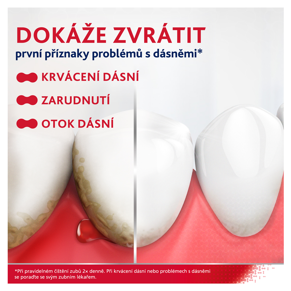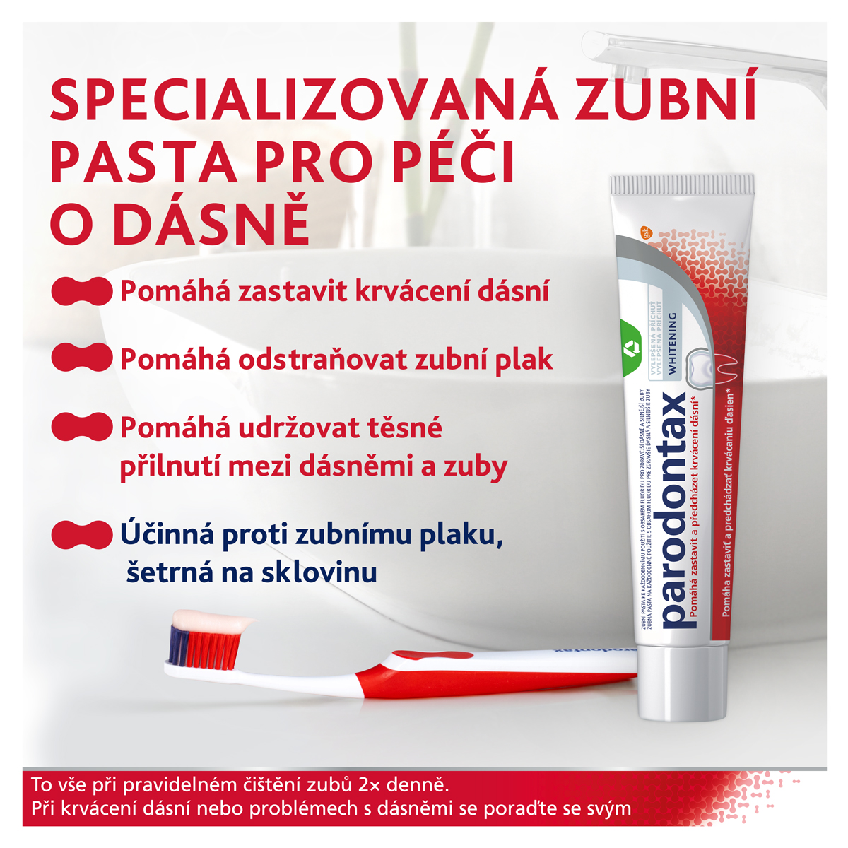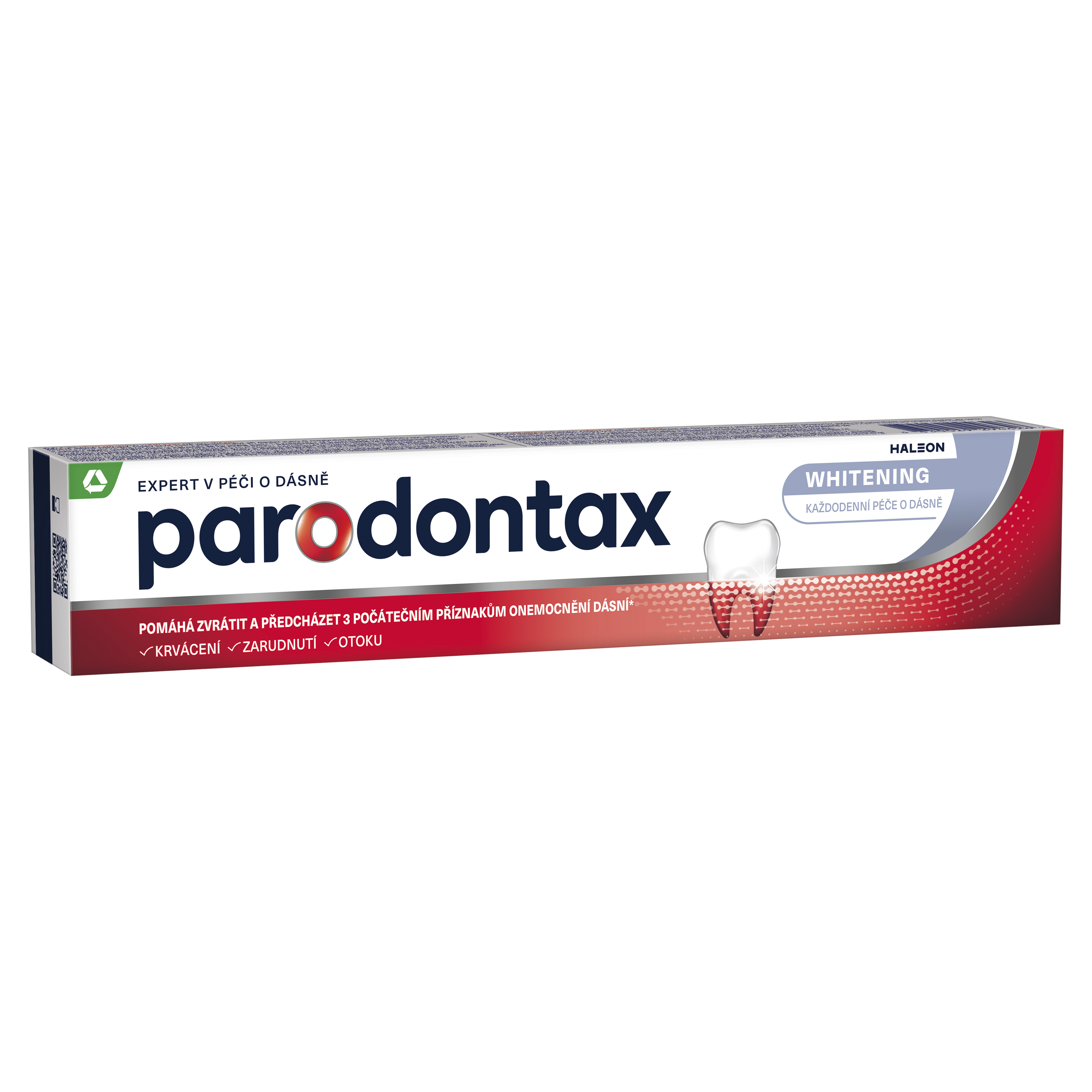 Zubní pasta ke každodennímu použití s obsahem fluoridu pro zdravější dásně a silnější zuby. Základem zdravých zubů jsou zdravé dásně. Zdravé dásně nekrvácí. Stopy krve, které zaznamenáte při čištění zubů či mezizubních prostor, mohou být příznakem onemocnění dásní. Pokud tento stav zanedbáte, může to vést k zápachu z úst, zarudnutí a otoku dásní, postupem času k ústupu dásní, uvolnění zubu, a nakonec až ke ztrátě zubu. Zubní pasta parodontax je speciálně navržena k fyzickému odstranění příčiny krvácení dásní. To napomáhá eliminovat bakterie množící se podél linie dásní, a tím udržovat dásně pevně přiléhající k zubům. Zároveň napomáhá posilovat zuby a osvěžuje dech. Zubní pasta parodontax Whitening jemným odstraňováním povrchových skvrn obnovuje přirozenou bělost zubů. Pomáhá zastavit a předcházet krvácení dásní*.