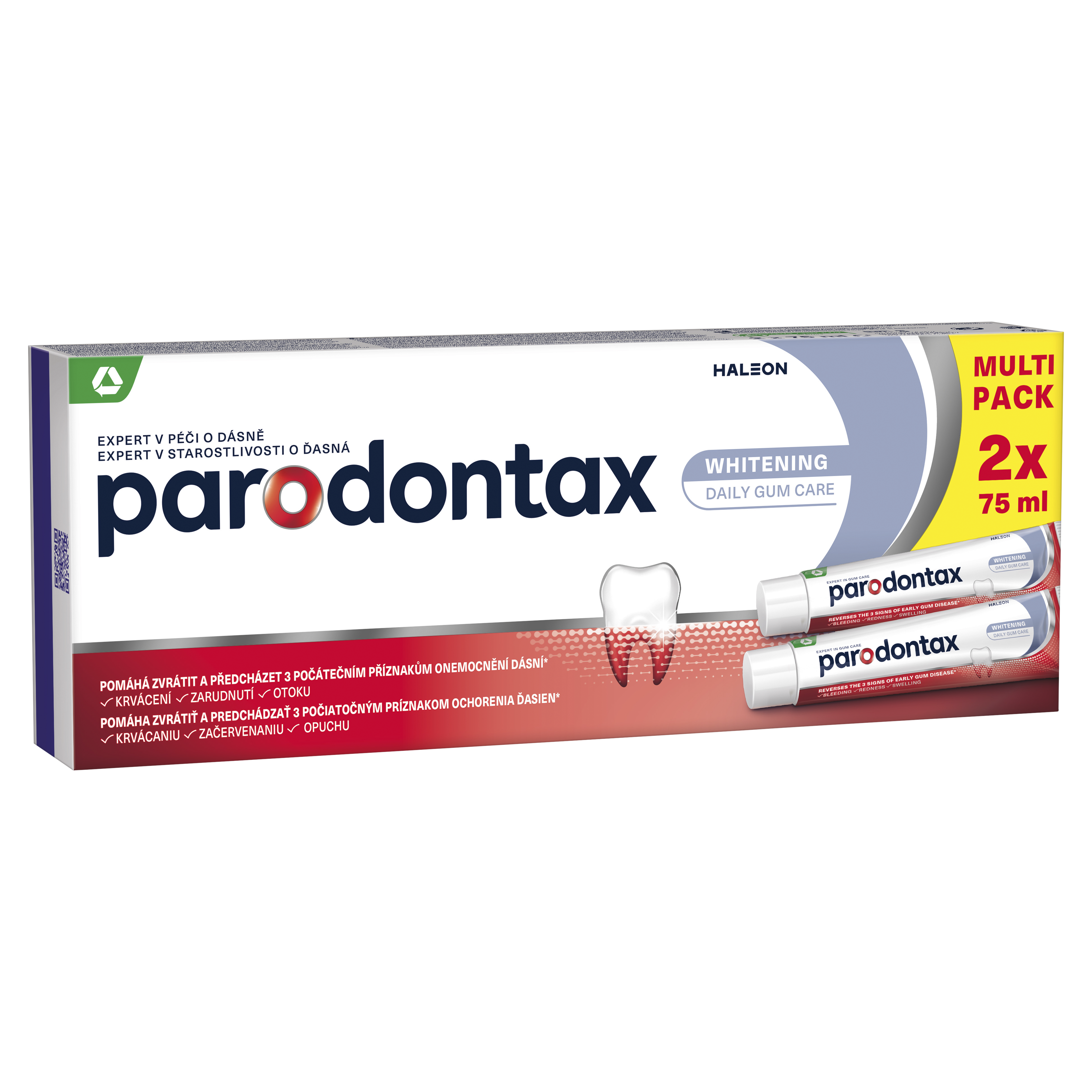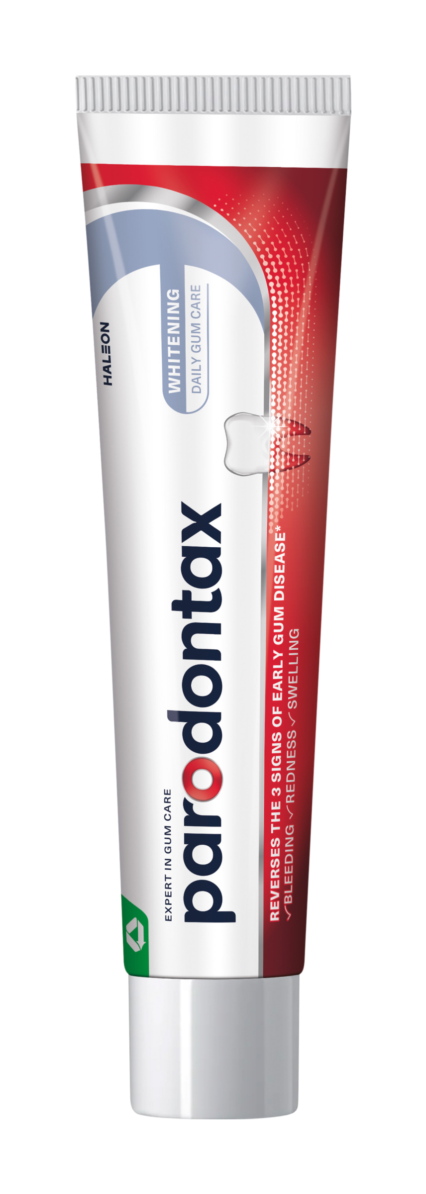 Zubní pasta ke každodennímu použití s obsahem fluoridu pro zdravější dásně a silnější zuby. Zubní pasta parodontax Whitening jemným odstraňováním povrchových skvrn pomáhá obnovit přirozenou bělost zubů. Pomáhá zastavit a předcházet krvácení dásní*. Vylepšená chuť.