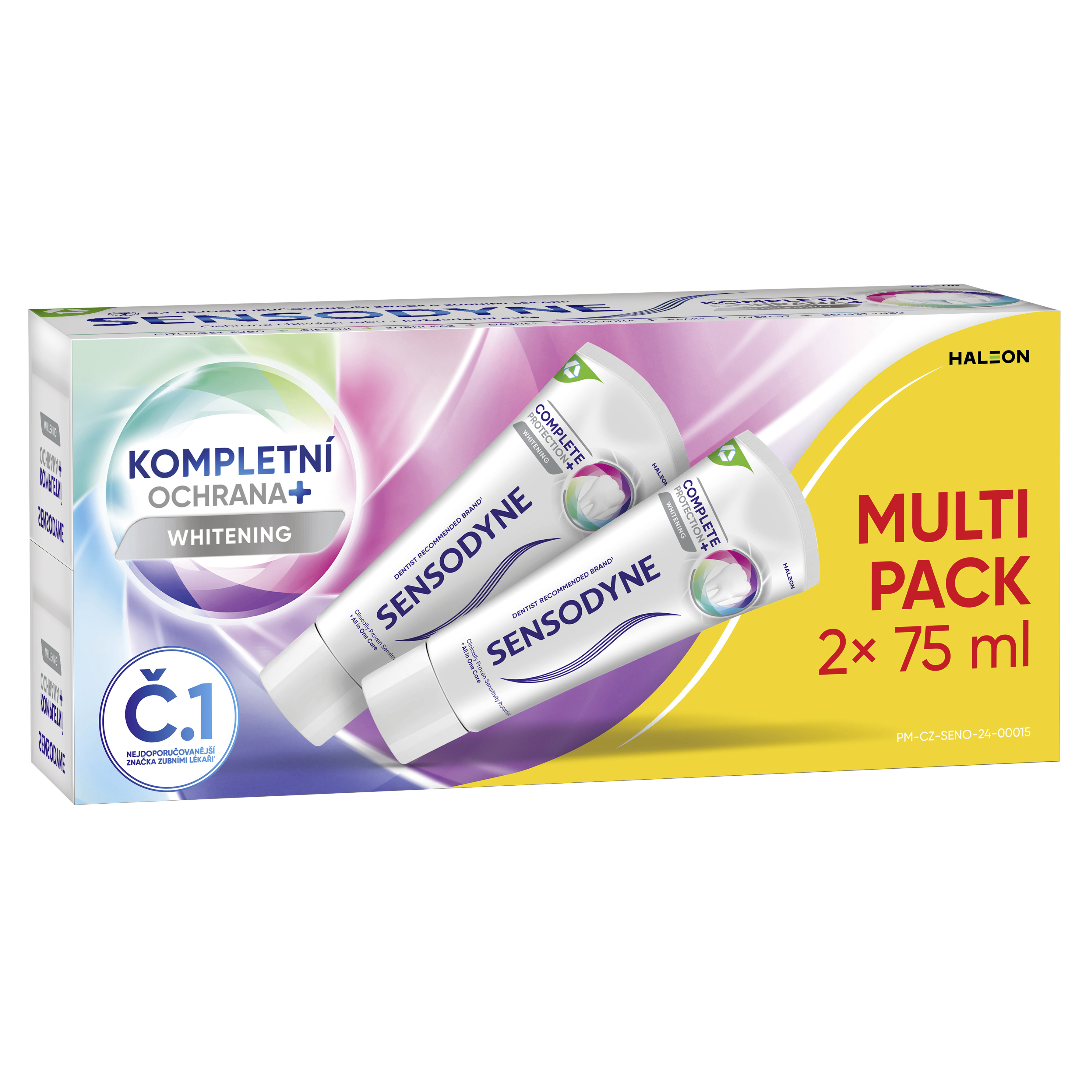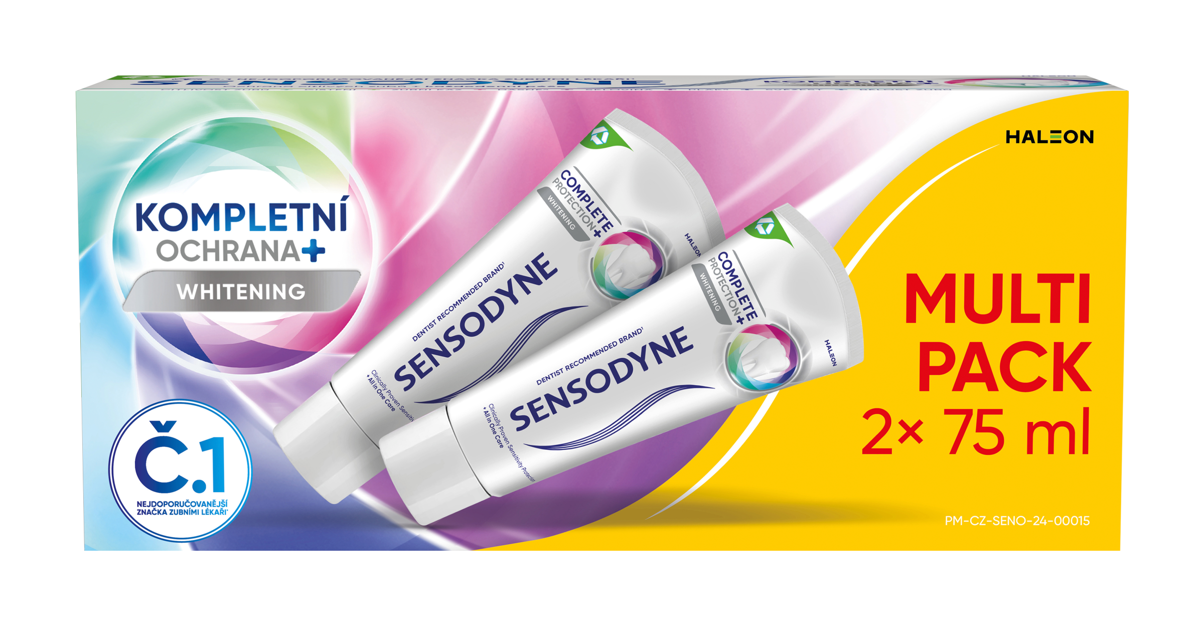 Nové složení - stejně skvělá ochrana před citlivostí zubů. Zubní pasta Sensodyne Kompletní ochrana + Whitening pro každodenní použití poskytuje mnoho výhod pro péči o ústní dutinu spolu s klinicky testovanou ochranou citlivých zubů². Pro ještě lepší obnovu přirozené bělosti zubů. Osvěžující mátová chuť plná přírodních výtažků. ²při pravidelném čištění zubů 2x denně. Č. 1 nejdoporučovanější značka zubními lékaři*. *V péči o citlivé zuby. Zubní pasty na citlivé zuby. IPSOS Expert Performance Tracking - Česká republika, 11/2024.