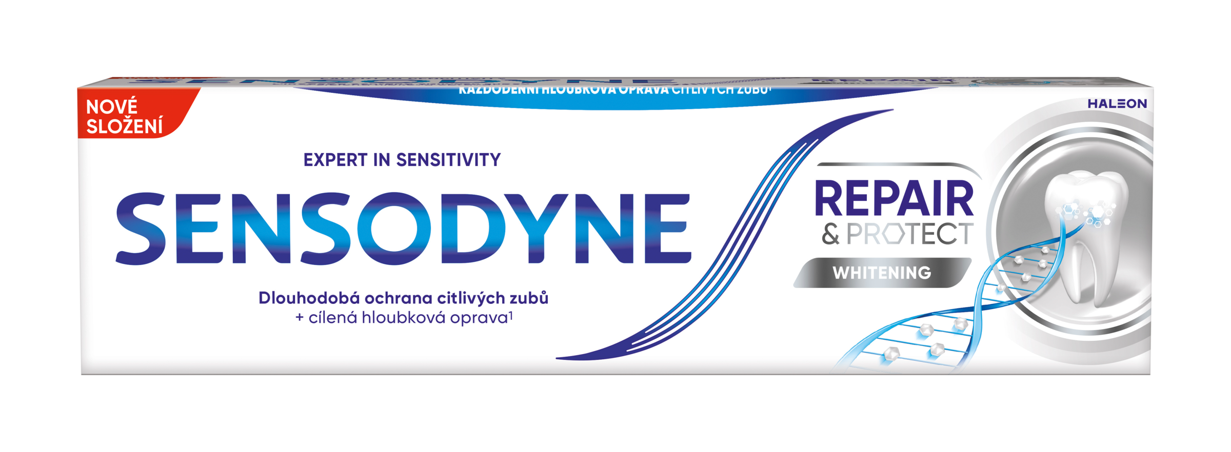 Zubní pasta Sensodyne Repair & Protect Whitening, s technologii NOVAMIN a složením na bázi vápníku, pomáhá opravovat místa obnaženého dentinu tím, že vytváří ochrannou vrstvu podobnou přirozené struktuře zubu. Ulevuje od citlivosti zubů*, abyste si mohli užívat život bez obav z bolesti citlivých zubů.