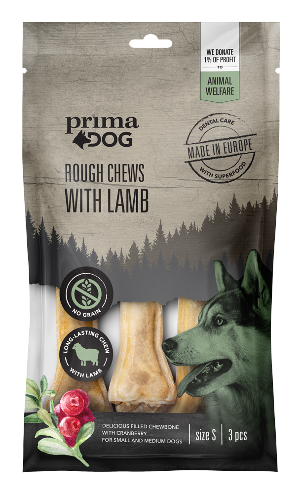 PrimaDog Rough Chews Jehně-Brusinka je chutná žvýkací kost, která podporuje zdravé zuby i ústní dutinu. Ukrývá v sobě chutnou náplň z jehněčího masa a severské brusinky, které jsou pro vašeho psa přirozený zdroj vitamínu C. Kost je bohatá na bílkoviny, neobsahuje žádné obiloviny a má nízký obsah tuků. Žvýkací kosti bez obilovin PrimaDog Rough Chews se vyrábějí v naší evropské továrně, neobsahují žádné konzervační látky a mají prvotřídní kvalitu.
